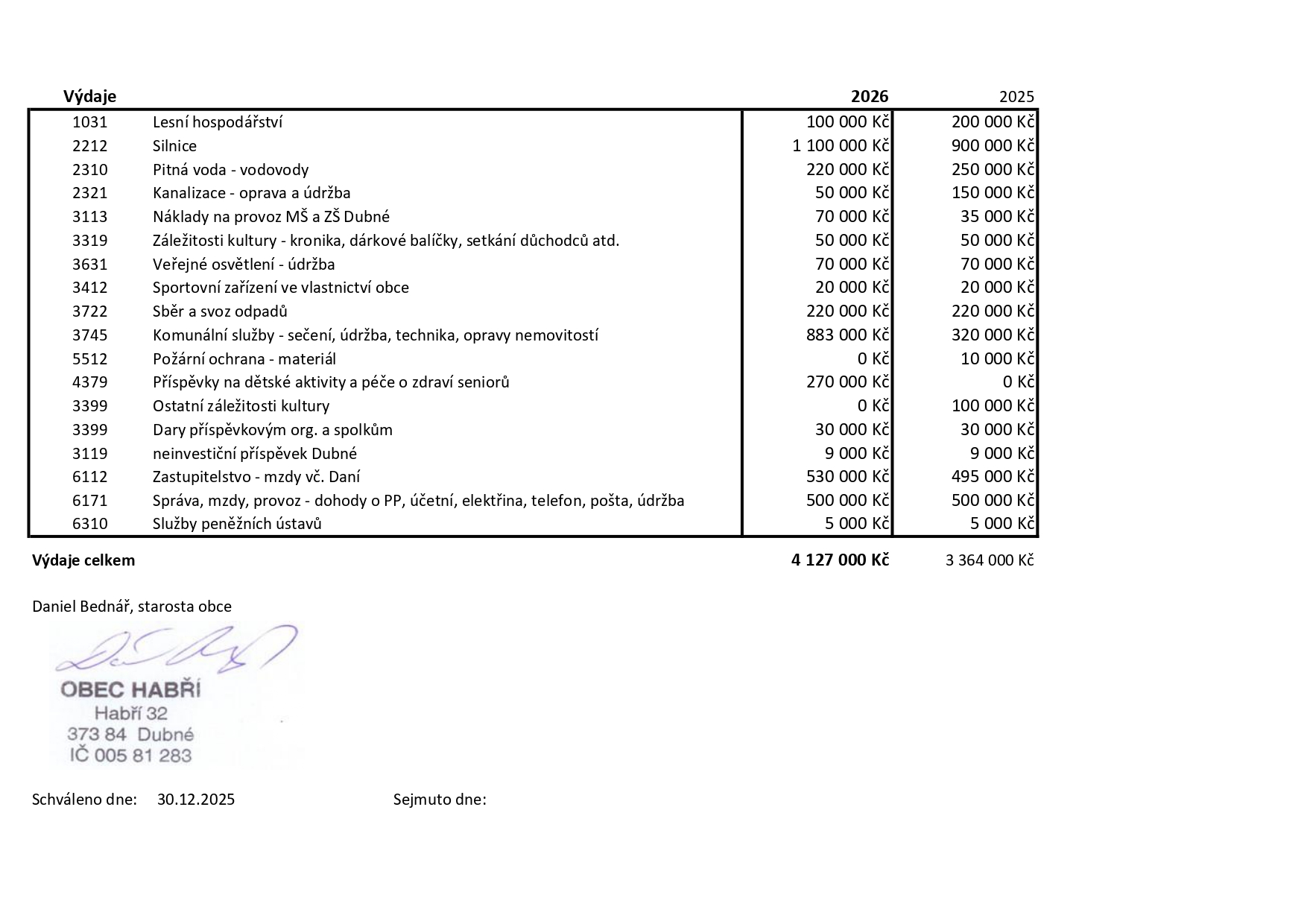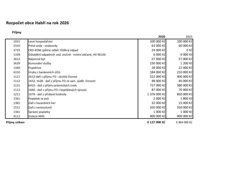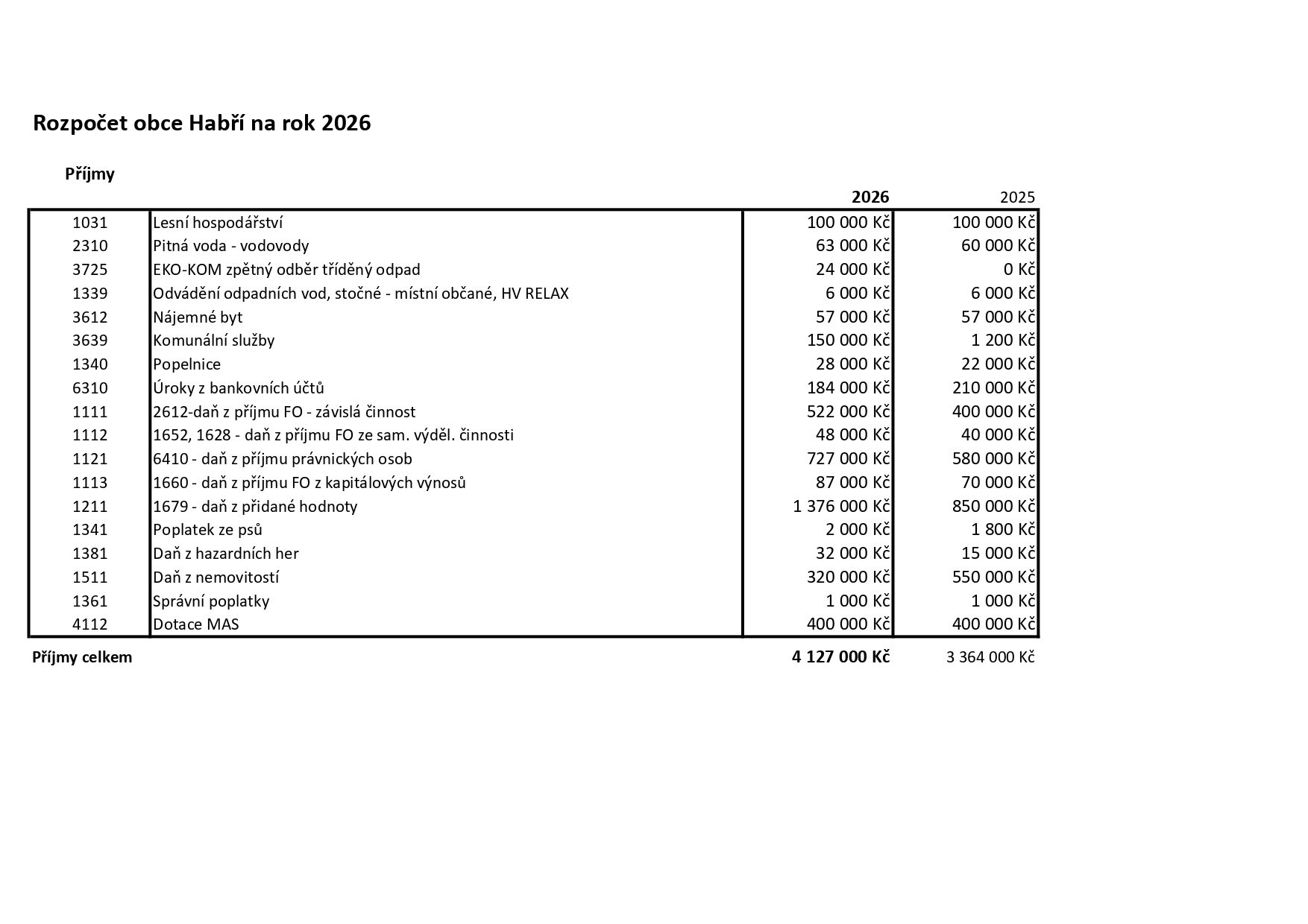 Schválený rozpočet obce Habří na rok 2026 Zveřejněno 31. 12. 202531. 12. 2025 - Daniel Bednář Zastupitelstvo obce Habří na svém zasedání 30.12.2025 schválilo rozpočet obce Habří na rok 2026. Rozpočet byl schválen jako vyrovnaný.